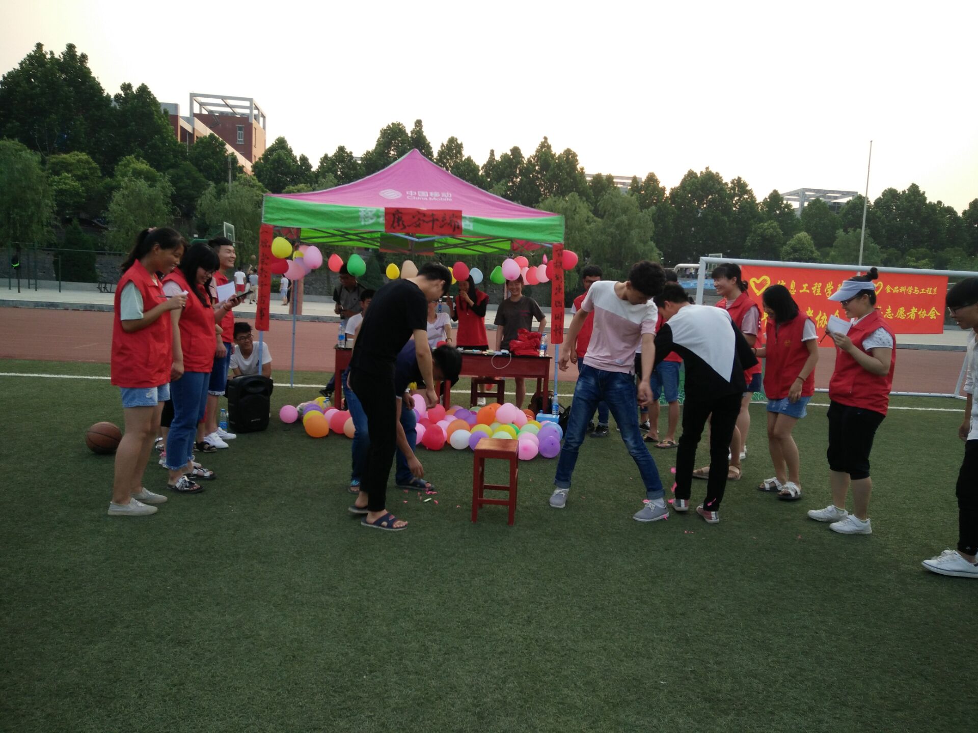 活動過程中,工作人員事先將字謎謎面放在充好的氣球里,再由參賽選手兩兩自由結(jié)合背靠背將氣球擠爆,取出謎面猜字謎,規(guī)定時間內(nèi)以猜對字謎最多的選手為勝出一方,既有“雄黃酒下肚,龍舟順?biāo)觥?、“三角四樓房,珍珠里面藏;想吃珍珠肉,解帶脫衣裳”以端午?jié)相關(guān)的字謎,也有“曲徑蟲鳴牡丹開,岷山遠游住人外,一義貫成并日月,百姓飯足言皆彩”以社會主義核心價值觀相關(guān)的字謎.晚飯路過的同學(xué)尋聲望去也積極參與,拼默契、抗干擾,你搶我答,積極競猜,一波又一波歡聲笑語不斷從操場傳來?;顒咏M織人員根據(jù)不同的獲獎等級分別準(zhǔn)備了精品小禮品、傳統(tǒng)的粽子和香囊,讓參與學(xué)生一起感受節(jié)日的氣氛。