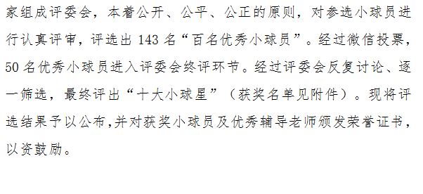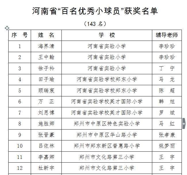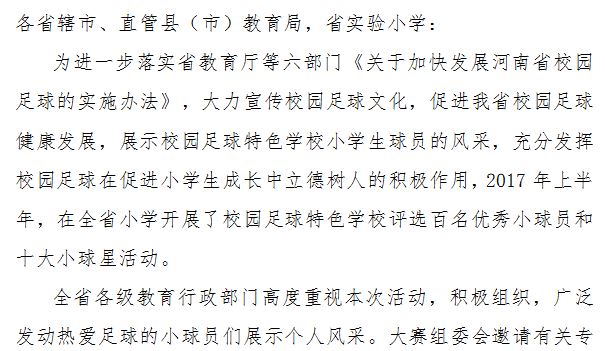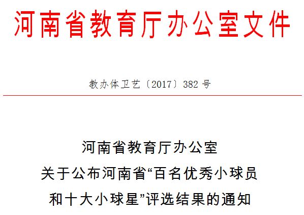 6月6日,河南省教育廳正式發(fā)文,向全省教育系統(tǒng)公布河南省首屆校園足球“百名優(yōu)秀小球員和十大小球星”的評選結果。