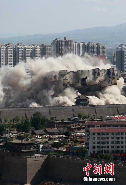 8月8日,山西大同,當(dāng)?shù)卣畬ξ挥诒背菈ξ涠ㄎ鏖T外的一座90米高的大樓實施爆破拆除,飛揚的塵土與古城墻呼應(yīng)形成壯觀場面。由于該樓位置與古城保護規(guī)劃有所沖突,當(dāng)?shù)卣畬ζ鋵嵤┍疲源思涌旃懦堑谋Wo與復(fù)興。 楊榮 攝