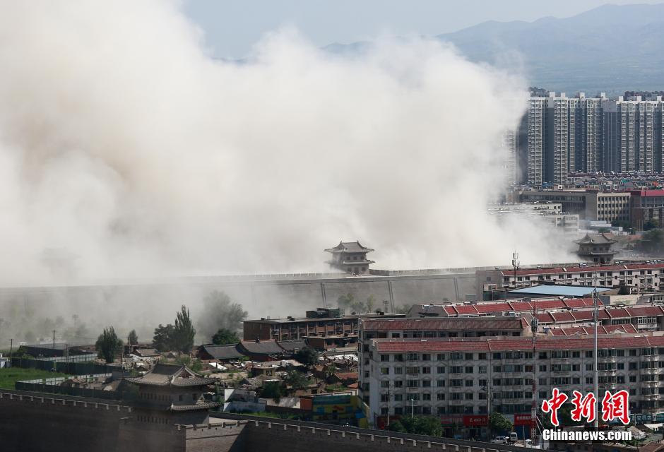 8月8日,山西大同,當(dāng)?shù)卣畬ξ挥诒背菈ξ涠ㄎ鏖T外的一座90米高的大樓實施爆破拆除,飛揚的塵土與古城墻呼應(yīng)形成壯觀場面。由于該樓位置與古城保護規(guī)劃有所沖突,當(dāng)?shù)卣畬ζ鋵嵤┍?,以此加快古城的保護與復(fù)興。 楊榮 攝